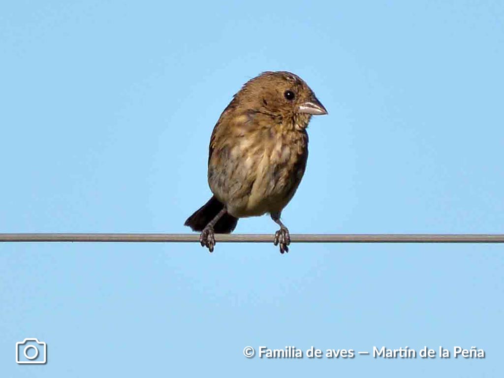 Hembra. Dorsal parda. Ventral ocrácea con el pecho estriado de pardo. Alas pardas ribeteadas de ocráceo. Cola parda.