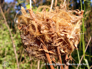 El nido tiene forma de tacita, es sostenido o atado a tallos de plantas. Emplea fibras vegetales. Internamente raicillas o algunas cerdas. Externamente puede tener líquenes. Expuesto. Elaborado.