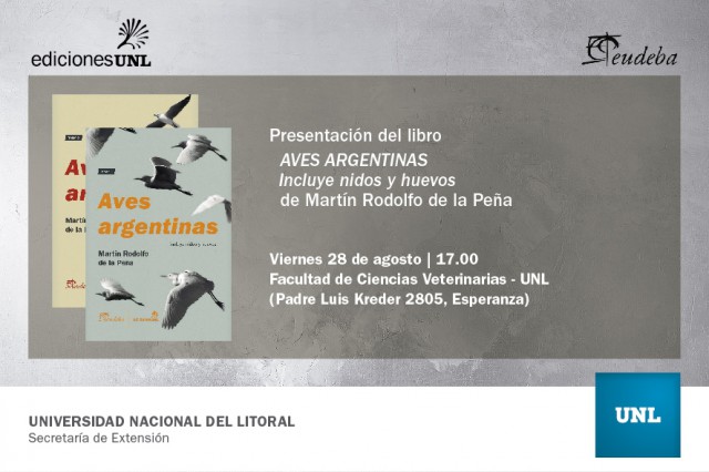 Se invita a toda la comunidad educativa y en general a la presentación del libro "Aves argentinas", cuyo autor es el Méd. Vet. Martín de la Peña, que se realizará este viernes 28 de agosto a las 15 hs. en el Aula Magna de la Facultad de Ciencias Veterinarias.