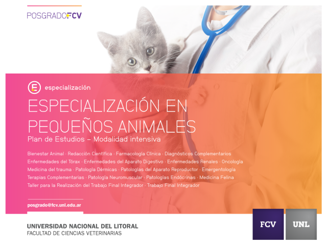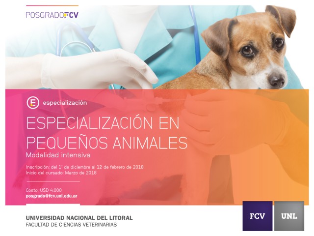 La Especialización en Salud de los Animales de Compañía, carrera de la Facultad de Ciencias Veterinarias de la Universidad Nacional del Litoral, lanzó una nueva cohorte en modalidad intensiva dirigida a estudiantes de la Argentina y principalmente residentes en otros países. Las inscripciones finalizan el 12 de febrero de 2018. El cursado inicia en marzo de 2018.