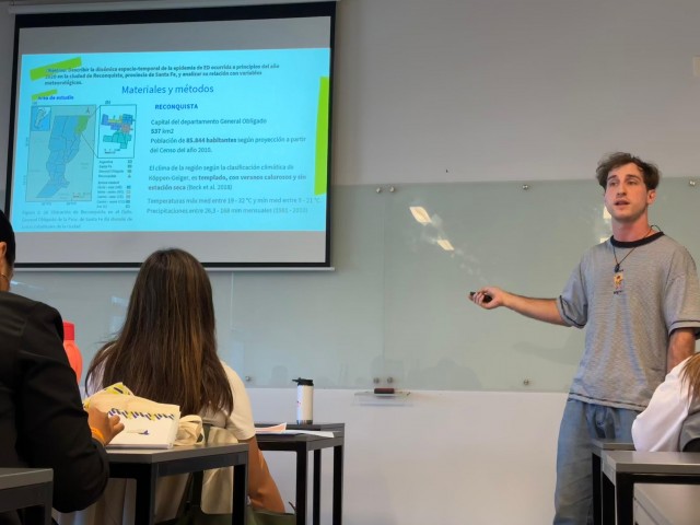 "Estoy presentando mi tema de Cientibeca. La exposición fue una experiencia muy enriquecedora y hubo un muy buen intercambio con los jurados y con otros investigadores", describió Alejo Canello, estudiante de la Licenciatura en Biotecnología de la Facultad de Bioquímica y Ciencias Biológicas.